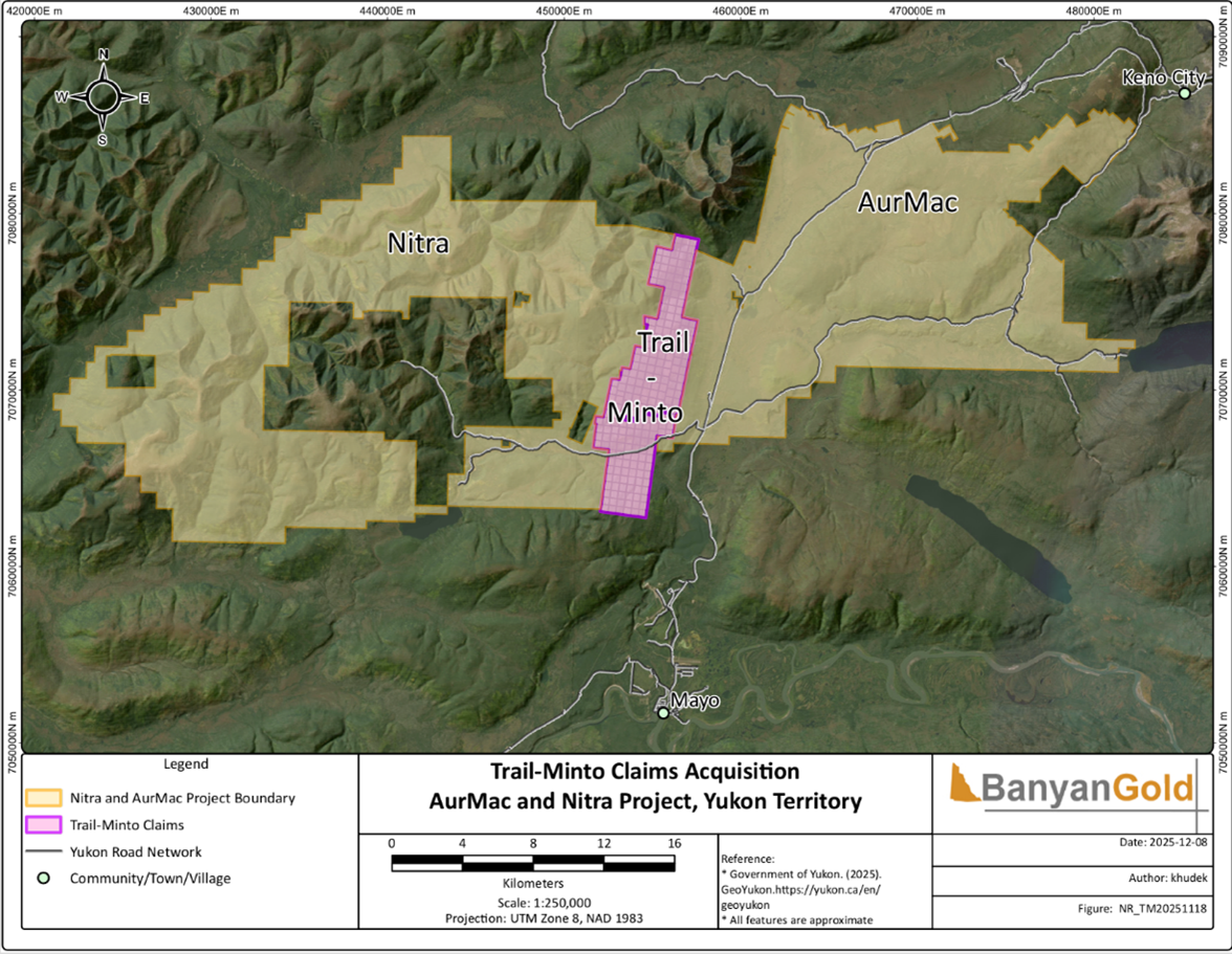 VANCOUVER, BC / ACCESS Newswire / December 17, 2025 / Banyan Gold Corp. (the "Company" or "Banyan") (TSXV:BYN)(OTCQB:BYAGF) is pleased to announce the strategic acquisition of Trail Minto Claims (total 229 claims) located between Banyan's AurMac Project ("AurMac") and Nitra Project ("Nitra") properties from Mayo Lake Minerals Inc. (CSE:MLKM) completing a district consolidation of almost 720 square kilometres ("sq km") around the AurMac Project (Figure 1).