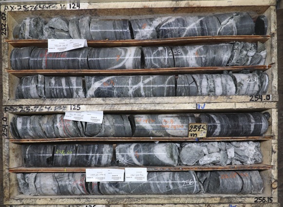 Continued drilling at Airstrip indicates potential to extend high-grade mineralization hosted in calc-silicate altered skarn horizons down-dip (Cal 1 and Cal 2; Figure 2). Mineralization in Airstrip is consistently hosted in skarn zones with intense silicification, quartz veining, and semi-massive pyrrhotite replacement-style mineralization (Figures 3-6). The high-grade mineralization intersected in AX-25-773 (Cal 1 - 1.10 g/t Au over 66.6m; Cal 2 - 0.95 g/t Au over 29.6m) highlights the continuity of high-grade mineralization and potential at depth for the Airstrip deposit to extend down-dip.