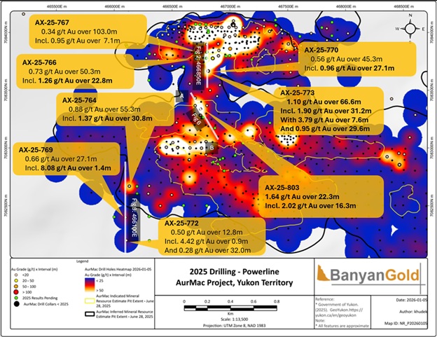 VANCOUVER, BC / ACCESS Newswire / January 8, 2026 / Banyan Gold Corp. (the "Company" or "Banyan") (TSXV:BYN)(OTCQB:BYAGF) is pleased to announce it has intersected new high-grade domains and visible gold in the Powerline Deposit ("Powerline") and high-grade skarn mineralization in the Airstrip Deposit ("Airstrip"), at its AurMac Project ("AurMac"), Yukon, Canada.