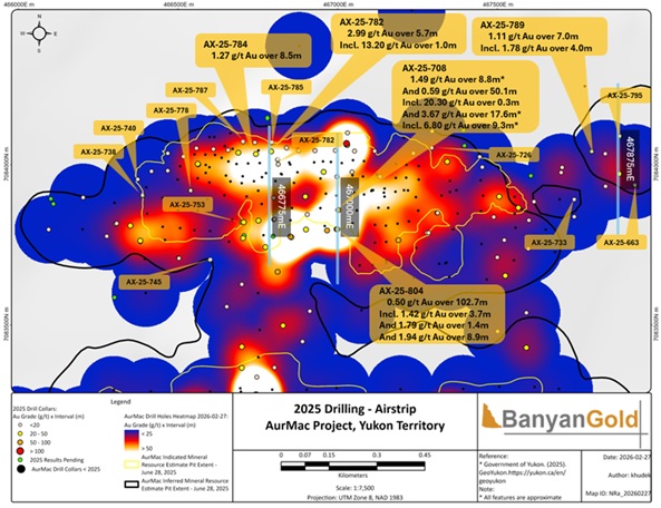 VANCOUVER, BC / ACCESS Newswire / March 10, 2026 / Banyan Gold Corp. (the "Company" or "Banyan") (TSXV:BYN)(OTCQB:BYAGF) is pleased to announce additional drill results with high-grade gold ("Au") mineralization in the Airstrip Deposit ("Airstrip") at its AurMac Project ("AurMac"), Yukon, Canada.