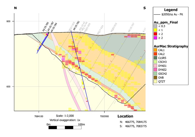 AX-25-782 - 2.99 g/t Au over 5.7m including high-grade interval of 13.20 g/t Au over 1.0m, AND 0.47 g/t Au over 32.8m;