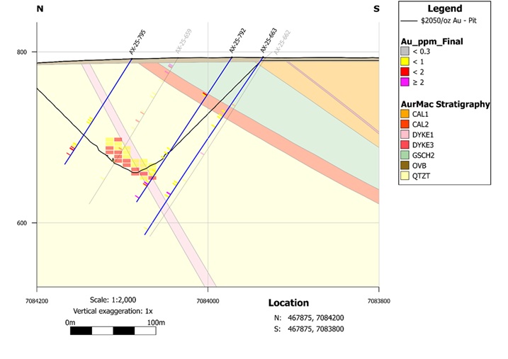 AX-25-804 - 1.42 g/t Au over 3.7m, 1.79 g/t Au over 1.4m, and 1.94 g/t Au over 8.9m, all within 0.50 g/t Au over 102.7m.