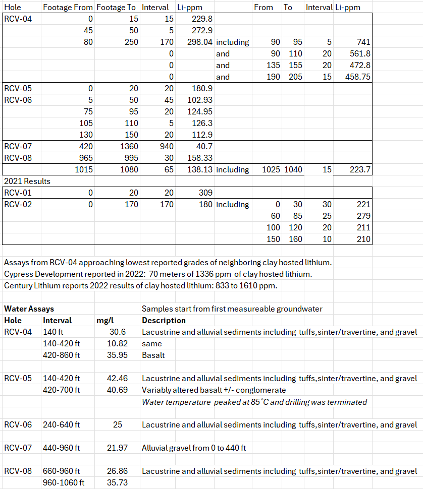 Lithium concentrations in water samples were determined in all holes. The best drill-cutting intercept occurs in RCV-04 in tuffaceous sediments between 80 and 250 feet with an average of 298 ppm Li that includes grades to 741 ppm and is worthy of further exploration. Published low-grade clay-hosted lithium assays are approximately 800-850 ppm. While lithium assays generally diminish to the north, there is still untested property to the south to explore for shallow, but higher-grade lithium which is of considerable interest to the Grid Exploration Team.