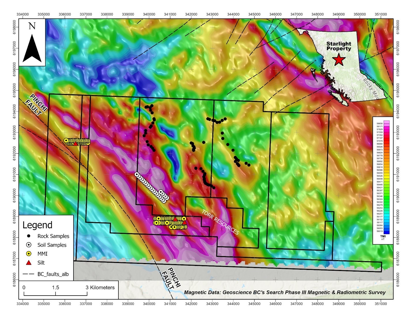 Northern Target: A discrete magnetic anomaly located along the main northwest-trending magnetic lineament that corresponds with the mapped trace of the Pinchi Fault.