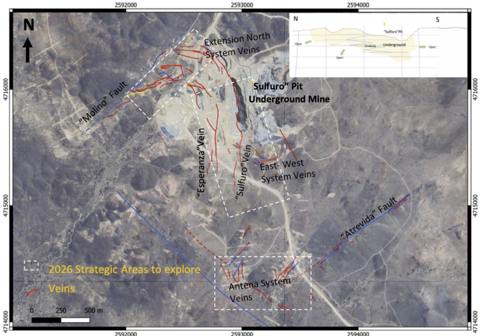 Current drilling is aimed at defining the depth and lateral extent of mineralization in the Sulfuro vein, which was historically exploited as the Paloma Open Pit and is now exploited as an Underground operation (see Figure 2). The second front of exploration is currently the Baritina vein (Paula Andrea area), where results to date have been encouraging, demonstrating continuity of the vein below surface (see Figure 3). During the second half of the year, exploration is expected to shift toward the Calandrias heap leach and the Martinetas plant areas.