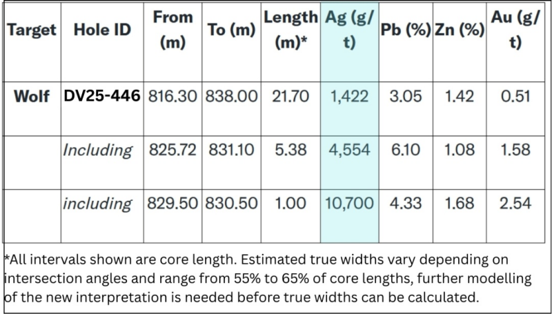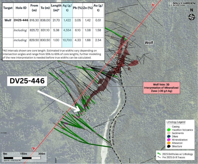 Vancouver, BC – September 4, 2025 – Global Stocks News - Sponsored content disseminated on behalf of Dolly Varden Silver. On September 2, 2025 Dolly Varden Silver (TSXV: DV) (NYSE American: DVS) (FSE: DVQ) announced that backfill directional drilling at the Wolf Vein in hole DV25-446 has intersected1,422 g/t silver over 21.70 meters, including 10,700 g/t silver over 1.00 meter.