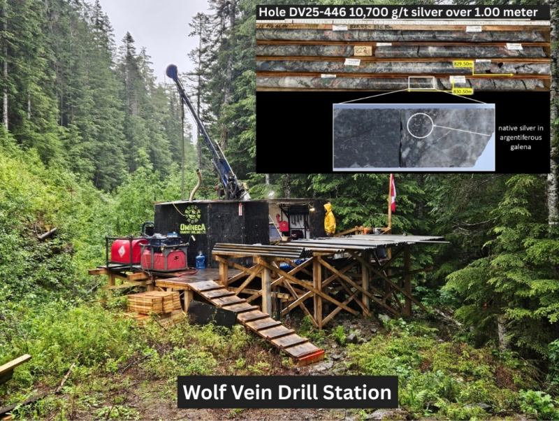 “These high-grade silver results over wide intervals suggest excellent continuity at the Wolf Vein,” stated Shawn Khunkhun, CEO of Dolly Varden Silver, in the August 2, 2025 press release. “The mineralization in drill hole DV25-446 includes native silver and is consistent with the robust style of mineralization with a significant increase in associated gold and base metal values. Additional drilling at Wolf is being prioritized for the remainder of the season.”