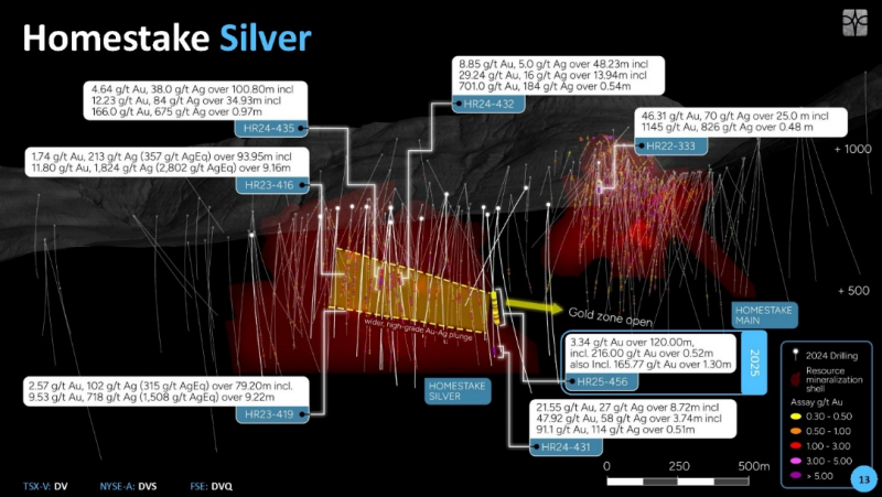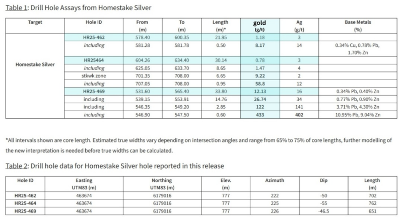 Hole HR25-469 targeted a large open area at the Homestake Silver Deposit, intersecting 26.74 g/t Au over 14.75 meters, including 122 g/t Au over 2.85 meters within a broader mineralized zone grading 12.13 g/t Au over 33.80 meters.
