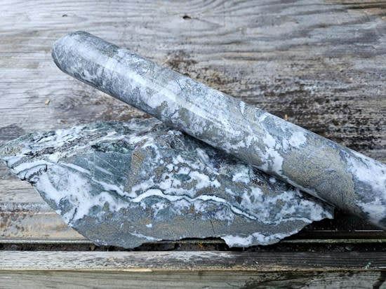 Above: Drill core from hole HR25-469 of a sample interval grading 91 g/t Au over 0.63 meters compared to a slab with similar gold grade from the 320 level at Ascot Resources' Premier Mine near Stewart, BC.