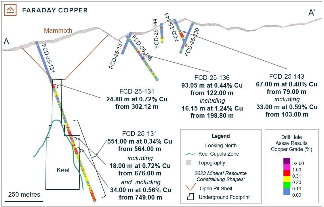 Expanded the Keel mineralization to the northeast, where drilling intersected 551.00 m at 0.34% copper from 564.00 m, including higher grade intercepts of 18.00 m at 0.72% copper from 676.00 m and 34.00 m at 0.56% copper from 749.00 m in drill hole FCD-25-131.