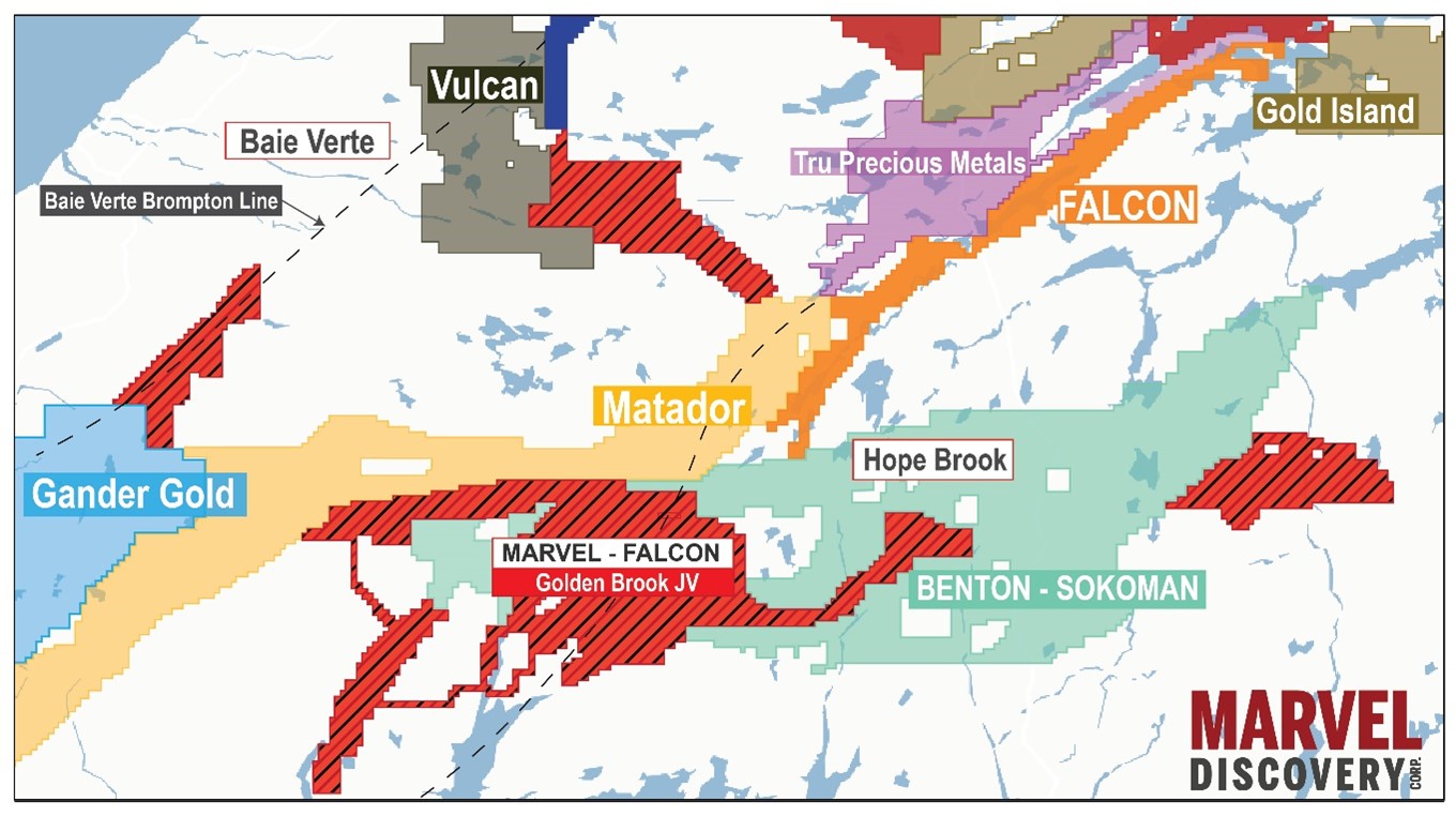 VANCOUVER, BC / ACCESSWIRE / October 25, 2023 / Marvel Discovery Corp.(TSX.V:MARV)(GR:O4T)(OTCQB:MARVF); and Falcon Gold Corp. (TSX.V:FG)(GR:3FA)(OTCQB:FGLDF) together (the Alliance) are pleased to announce the companies have received assay results from the late spring, early summer 2023 exploration program conducted over the Kraken project located in Southern Newfoundland. The project covers the central portion of the Golden Brook Property and is located approximately 150 kilometers south of Deer Lake. Samples from the first pass reconnaissance program have identified multiple anomalies from rock samples, including: