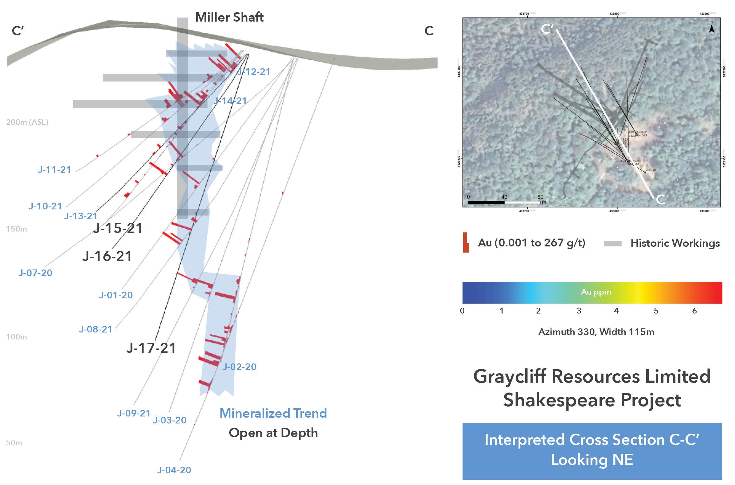 "Thus far, the assay results from the Phase Two core drilling program continue to expand the defined strike length of the known gold mineralization proximal to the historic Miller shaft. We have now reported gold mineralization along a strike length of approximately 115 metres, and we have not yet defined a lower limit to the gold mineralization that includes significant gold values as well as visible gold in strongly veined and silicified schist with associated sulphide mineralization. As previously indicated by the Company's CEO, we expect that our efforts to develop a 3D model for the geology, structure and gold mineralization close to where we are drilling will help us better define the structural and mineralogical parameters associated with the gold mineralization at Shakespeare. We also anticipate that our ongoing modelling will provide us with new "blue sky" targets along the six kilometres of general strike length. Based on our work to date, we see no reason for the gold mineralization to not continue well below the areas now being tested," stated Bruce Durham, Technical Advisor and QP.
