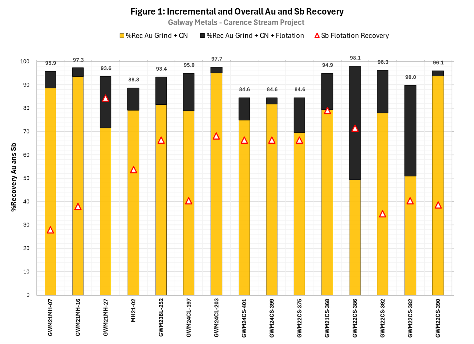 Gold extraction of 85-98% and antimony recovery of up to 84% has been confirmed from variability testing of mineralization containing up to 5% Sb using a hybrid Au-Sb cyanidation-flotation process.