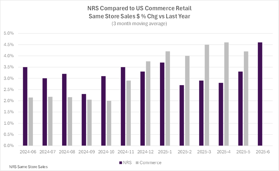 Over the past twelve months, the US Commerce Department’s Advance Monthly Retail Trade data, excluding food services, outpaced the NRS network’s three-month moving average same-store sales by 0.1% on average. In May, the Commerce Department’s three-month rolling average increase exceeded the US Commerce Department’s by 0.9%.
