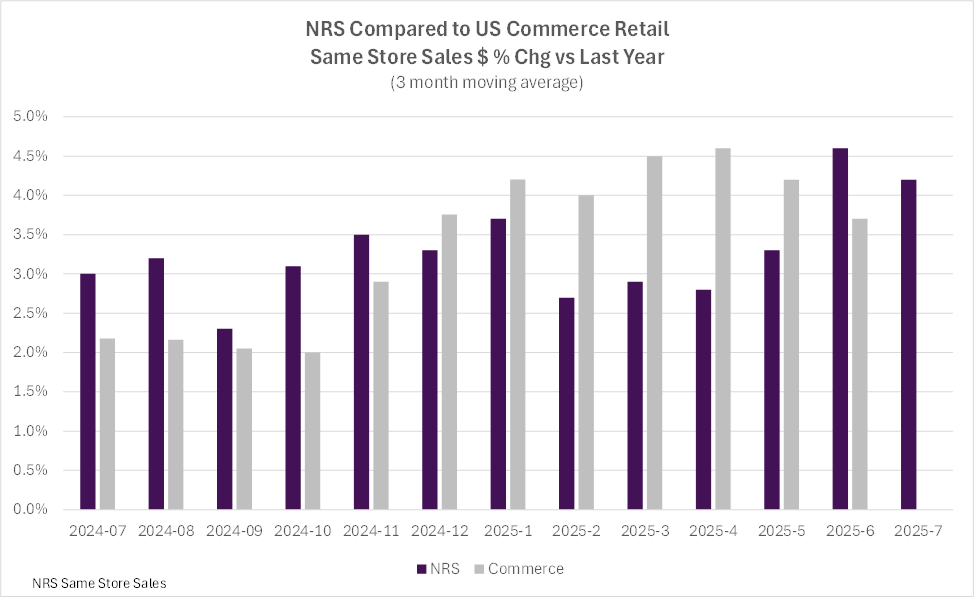 Over the past twelve months, the US Commerce Department’s Advance Monthly Retail Trade data, excluding food services, outpaced the NRS network’s three-month moving average same-store sales by 0.2% on average. In June, the NRS network’s three-month rolling average increase exceeded the US Commerce Department’s by 0.9%.