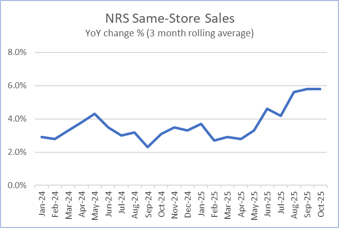 Same-store data comparisons of October 2025 with October 2024 are derived from approximately 229 million transactions processed through the approximately 23,800 stores on the NRS network that scanned transactions in both months. Same-store data comparisons of October 2025 with September 2025 are derived from approximately 280 million transactions processed through approximately 31,700 stores.