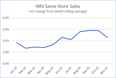 “NRS’ independent retailer network generated steady momentum in November, with transactions up 0.9% and dollar sales increasing 3.8% versus November a year ago.