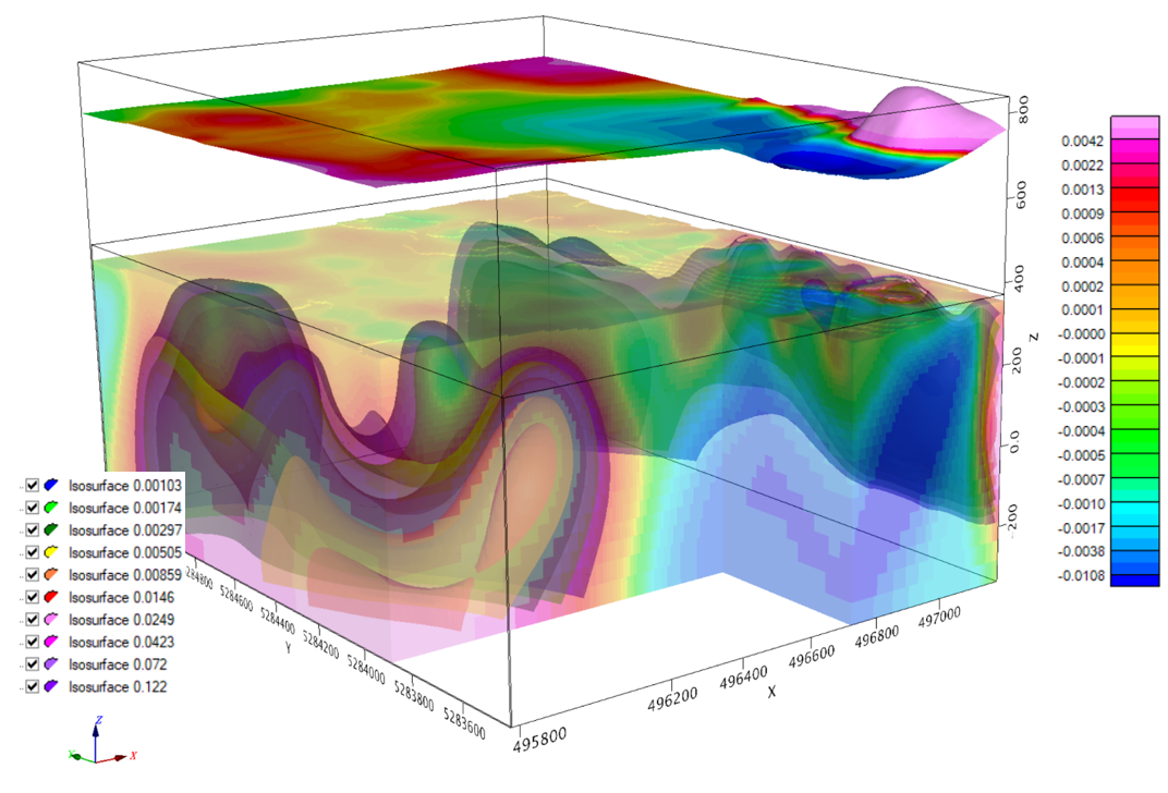Figure 2 - 3D Image looking to the NE displaying TMI surface image over Magnetic Susceptibility 3D Inversion Isosurfaces