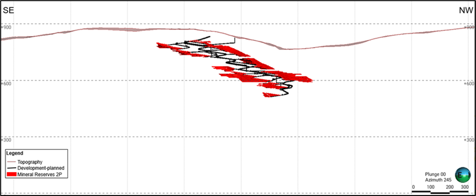 The Longitudinal sections shown in Figure 6 illustrate the spatial distribution of the Mineral Reserves and actual development at the Pilar Mine.