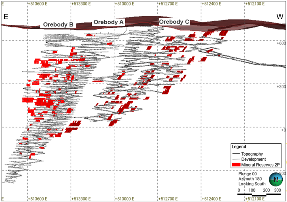 The Proven & Probable Mineral Reserves for Orebodies A, B, & C currently total 128 koz (1,225 kt @ 3.26 g/t Au), unchanged from the previous disclosure. These reserves are allocated as follows: Orebody A holds 29 koz (226 kt @ 3.95 g/t Au), Orebody B contains 30 koz (304 kt @ 3.04 g/t Au), and Orebody C comprises 70 koz (695 kt @ 3.12 g/t Au).
