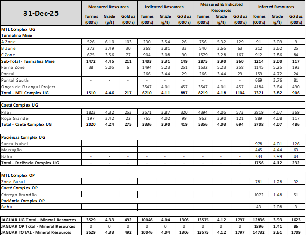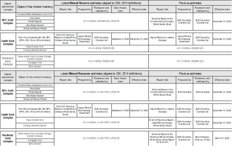 During 2025, the Pilar Mine was Jaguar's sole operating mine, with the Turmalina Mine in the MTL Complex returning to operating status in March 2026 (see Jaguar Mining Press Release dated March 9, 2026). As a result, only the Mineral Resource and Mineral Reserve (MRMR) for the Pilar Mine has been updated, as MTL remained on an embargo-related halt and no additional drilling could be completed throughout 2025. For the Onças de Pitangui (OdP) project, the MRMR figures remain unchanged from those reported in March 2025, despite an infill drilling program that commenced in 2025 and will continue through 2026. For both assets MTL and OdP, the Company plans to update the mineral resources next year.