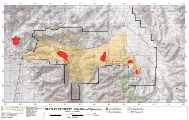Kimberly Ann, Lahontan Gold Corp. Executive Chair, Founder, CEO, and President commented: "Receiving approval of the Santa Fe Mine project EPOO represents a landmark milestone for Lahontan. Until now, the Company's exploration activities were limited to a five-acre disturbance area, significantly restricting its ability to step out from known resources and fully assess the exploration potential of the Santa Fe Mine Project. With the approval of the EPOO, Lahontan can now explore a 12.2 km² area encompassing multiple well-defined geological and geochemical targets located between and adjacent to existing gold and silver resources. The expanded permit area also allows for drill testing of the historical heap leach pads, which may contain remnant mineralization of potential economic interest. This approval positions the Company to evaluate the broader gold and silver endowment of the Santa Fe Mine project and to unlock the full potential of its strategic land position in Nevada's Walker Lane. Lahontan would also like to thank the staff of the Carson City office of the BLM for their efficient and timely completion of the EPOO."