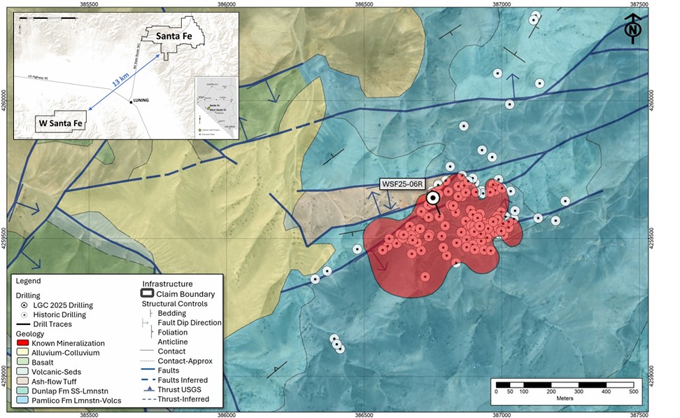 Drill hole location map for WSF25-06R, West Santa Fe Project, Nevada. The surface projection of known mineralization based on historic drilling is shown in red. Proximity to the Santa Fe Mine project is highlighted by the inset map.