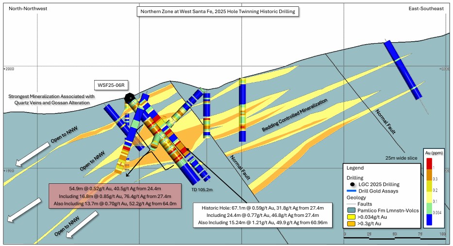 Cross section through drill hole WSF25-06R, West Santa Fe project, Nevada. The results from this drill hole compare favorably with historic drilling, both in the tenor of mineralization and the geometry. The results in part validate the historic drill hole data and together, demonstrate that gold and silver mineralization is open down-dip to the north-northwest.