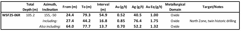 WSF25-06R: 54.9 metres (24.4 - 79.3m) grading 1.00 g/t Au Eq including 16.8 metres (27.4 - 44.2m) grading 1.75 g/t Au Eq: A shallow, thick, intercept of oxide gold mineralization confirming gold and silver mineralization reported in historic drill holes