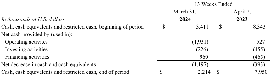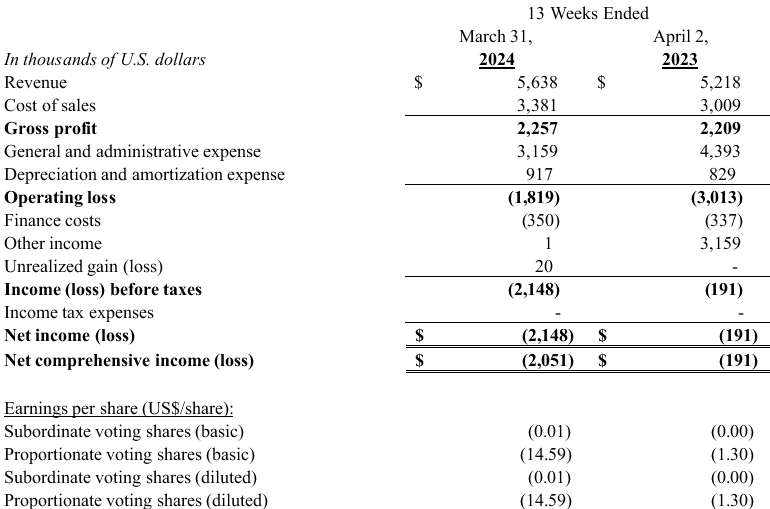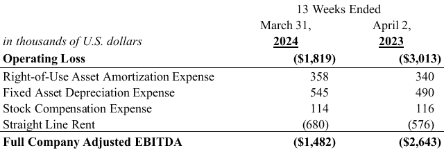 The following table outlines the consolidated statements of loss and comprehensive loss for the thirteen weeks ended March 31, 2024 and April 2, 2023: