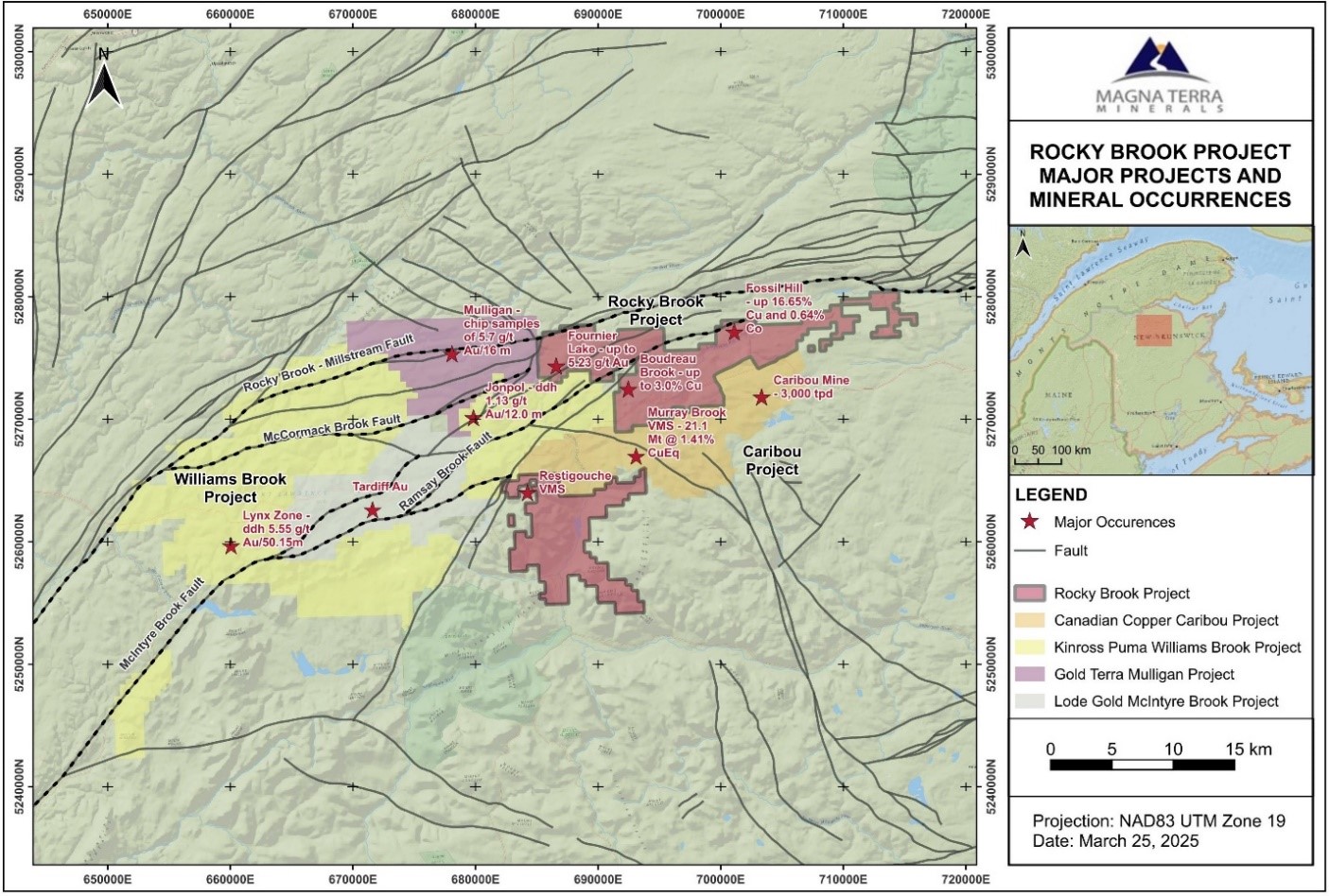 Figure 1: A map showing the location of the Rocky Brook Project, adjacent exploration projects, fault zones, and mineral occurrences.
