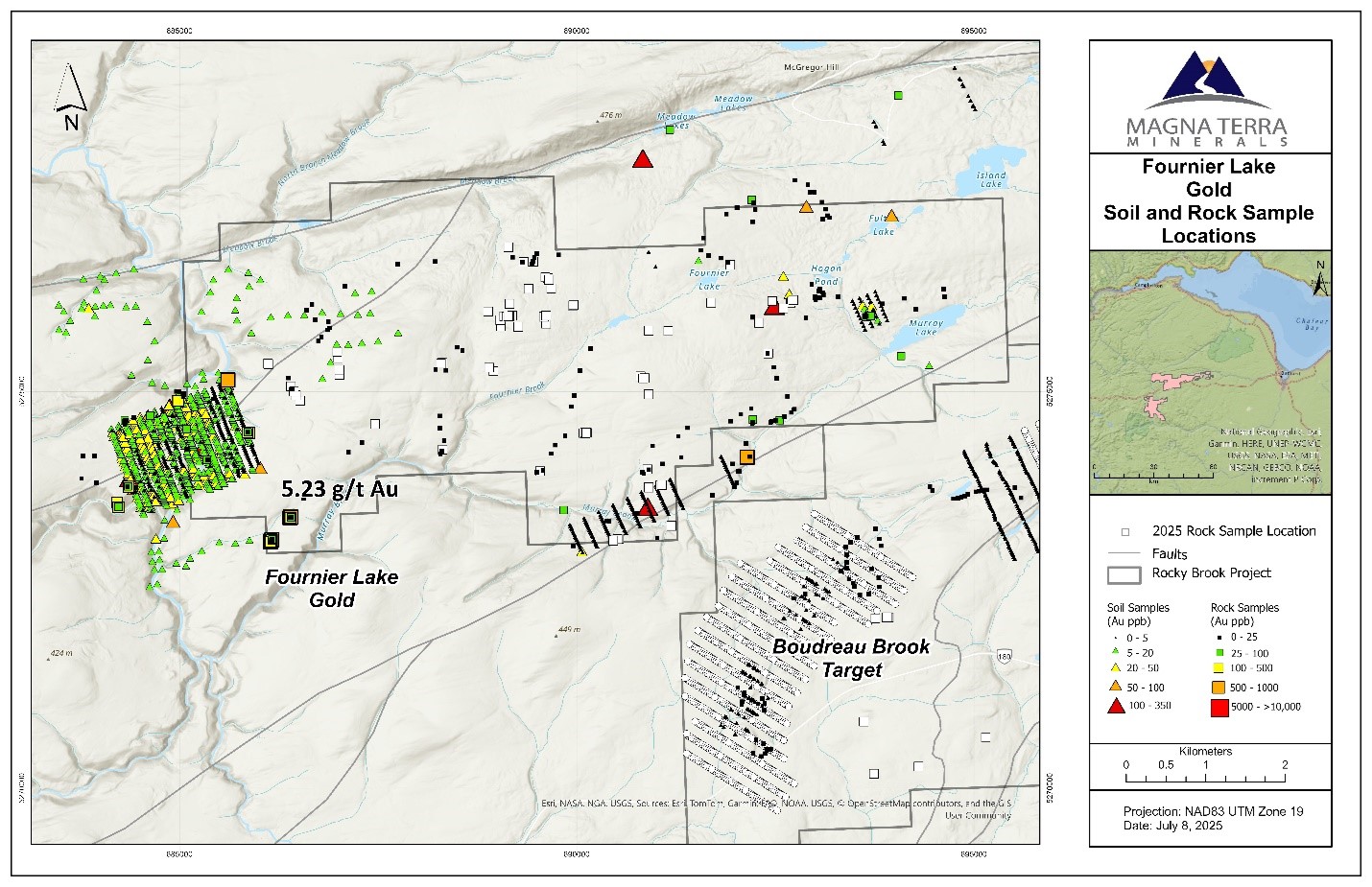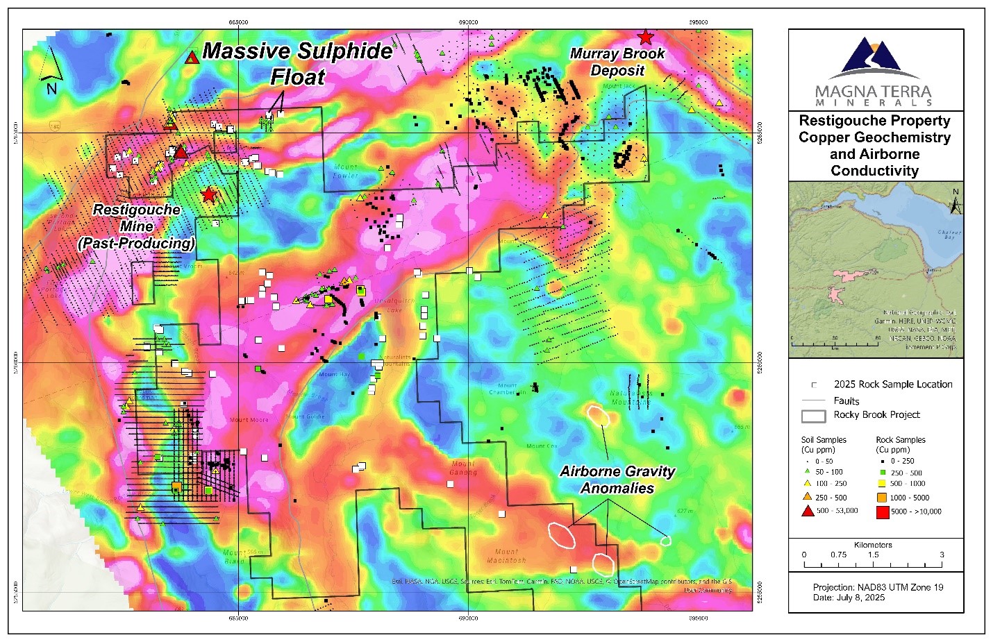 TORONTO, ON / ACCESS Newswire / July 10, 2025 / Magna Terra Minerals Inc. (the "Company" or "Magna Terra") (TSXV:MTT) is pleased to announce that it has completed its first phase of field work on its recently acquired Rocky Brook Project ("Rocky Brook" or the "Project"), located in the prolific Bathurst Mining Camp of northern New Brunswick (Figure 1). During field work, the team identified rock float (boulder) samples* of massive sulphide over a strike length of 250 metres that is coincident with an east-west trending airborne conductor between the Restigouche and Murray Brook Deposits (Figures 2 and 3). The two locations of massive sulphide float consist of largely pyrite, pyrrhotite with minor amounts of sphalerite. In addition,1,970 B-horizon soil samples were collected over the Boudreau Brook Trend and 236 rock float and outcrop samples* were collected over the Project area during prospecting and geological mapping. The Company has also compiled significant historical data that has resulted in the identification of the Boudreau Brook Trend - a 15-kilometre-long zone of coincident airborne electromagnetic conductivity and anomalous Cu-Zn-Co rock and soil samples. The Boudreau Brook Trend includes other known occurrences at the Boudreau Brook and Fossil Hill targets, where previous rock grab sampling* has returned 3% Cu and 16.65% Cu and 0.64% Co, respectively as well as highlighting several other coincident geochemical and geophysical targets (Figures 4 and 5).