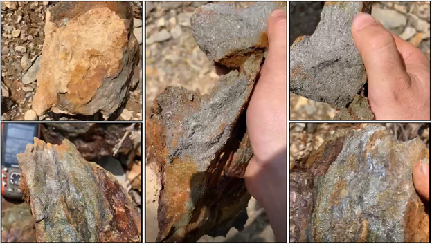 Figure 3: Field photographs of angular to subangular massive sulphide float from the Restigouche Property.
