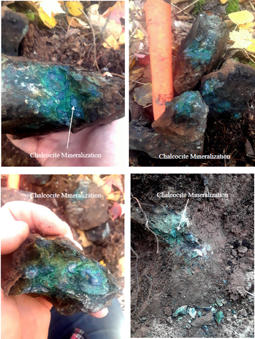 Figure 5: Field photographs of outcropping and float showing chalcocite, malachite, and chalcopyrite mineralization within rocks from previous grab samples from the Boudreau Brook occurrence.