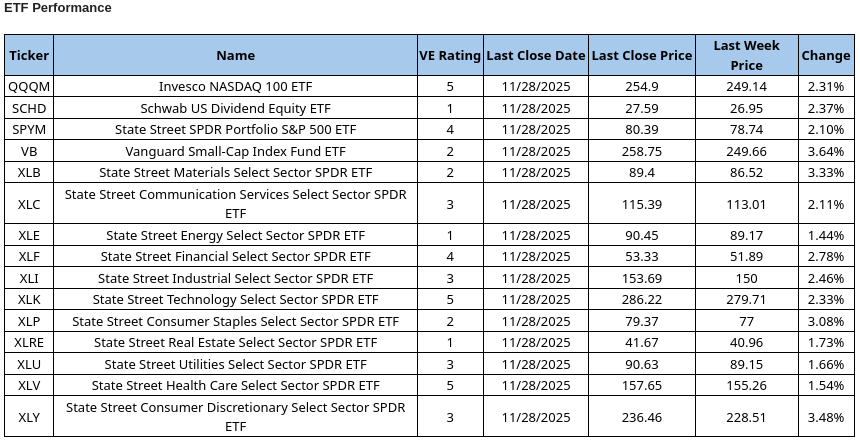 What a difference a week makes! In last week’s update, we documented empirically that the story of November 2025 thus far was rotation from mega-cap tech and growth stocks to value stocks. The Invesco Nasdaq-100 ETF, QQQM, and the SPDR S&P 500 ETF, SPYM, were both deep into negative territory.