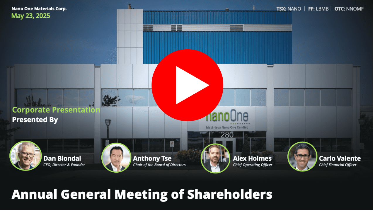 VANCOUVER, BC / ACCESS Newswire / May 26, 2025 / Nano One® Materials Corp. ("Nano One" or the "Company") (TSX:NANO)(OTC PINK:NNOMF)(Frankfurt:LBMB), a process technology company specializing in lithium-ion battery cathode active materials provides a summary of the results from the Annual General Meeting.