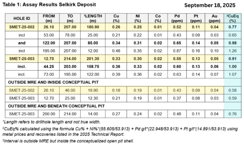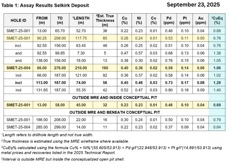 Mineralization outside the Mineral Resource Estimate (MRE) and within the current conceptual pit shell demonstrated the potential for expansion of the deposit toward the surface: SMET-25-001: starting at 13.00 metres from surface, 45.00 metres of 0.69% CuEq (0.23% Cu, 0.23% Ni, 0.46 ppm Pd, 0.10 ppm Pt).