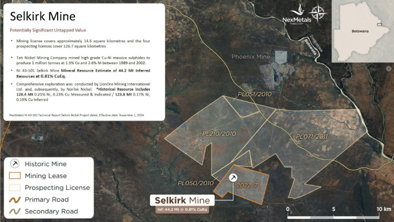 Selkirk is a past-producing copper-nickel-cobalt-platinum group elements (Cu-Ni-Co-PGE) mine in Botswana. It is situated 28 kilometers south-east of the city of Francistown (pop. 103,000), and 75 kilometers north of NexMetals’ Selebi Mines.