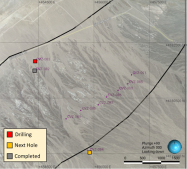 With the completion of CVZ-82, the drill has moved to CVZ-83 and drilling is in progress. Sampling of the core using an industry standard QA/QC protocol is underway. Samples are to be delivered to ALS Laboratories in Reno, Nevada for assaying. Assay results are pending.