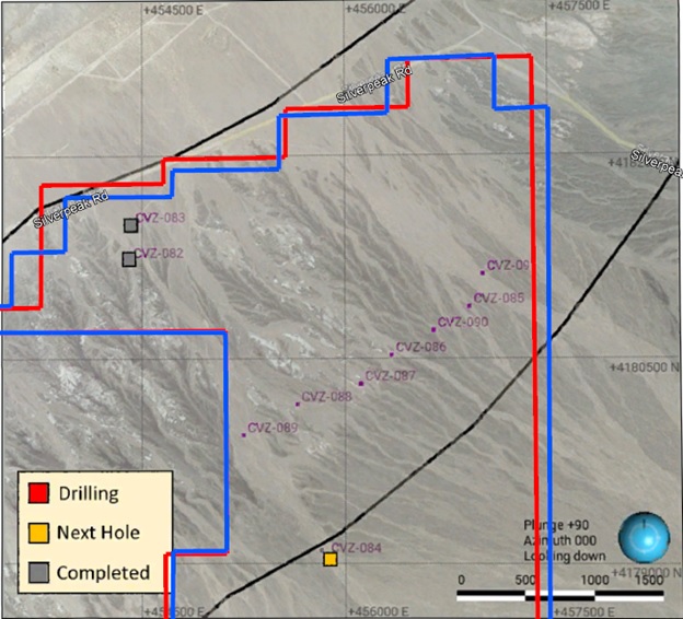 With the completion of CVZ-83, the drill has moved to CVZ-84 and drilling is in progress. Sampling of the core using an industry standard QA/QC protocol is underway. Samples are to be delivered to ALS Laboratories in Reno, Nevada for assaying. Assay results are pending.