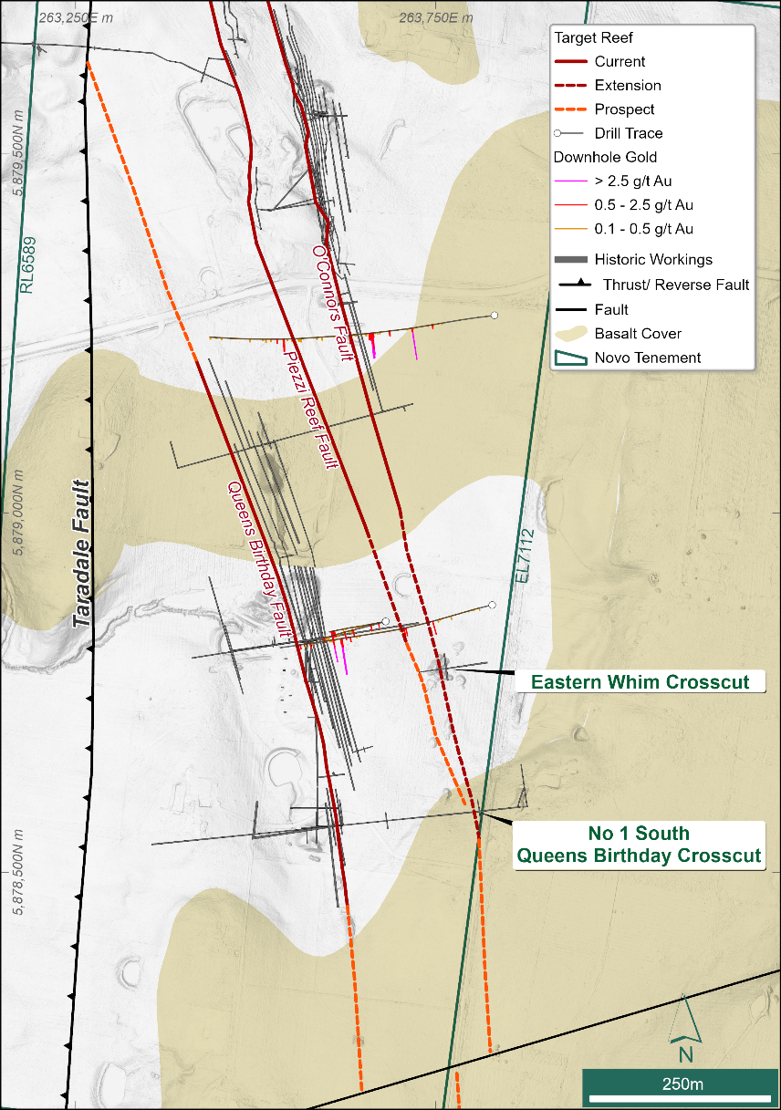 The Piezzi/Stackyard and O’Connor’s reefs were intersected in BTD006 during Novo’s 2023-2024 diamond drilling campaign (Figure 2 and Figure 4). A significant intersection of 7 m @ 1.88 g/t Au from 179 m; including 3.19 m @ 3.42 g/t Au from 182.81 m correlates with the modelled NW extension of the Piezzi/Stackyard Reef (Figure 6)d; whilst a significant intersection of 1.56 m @ 0.55 g/t Au from 238.14 m correlates with the modelled NW extension of the O’Connor’s Reef. These intersections are beyond the northwest strike limits adopted in the 2024 Belltopper Exploration Target for both reefs. The updated 2026 Exploration Target extends the strike of both reefs to drill hole BTD006, where the reefs manifest as “blind,” targets below the surface and in the footwall of the west-dipping Taradale Fault. Both reefs remain open at depth and to the NW.