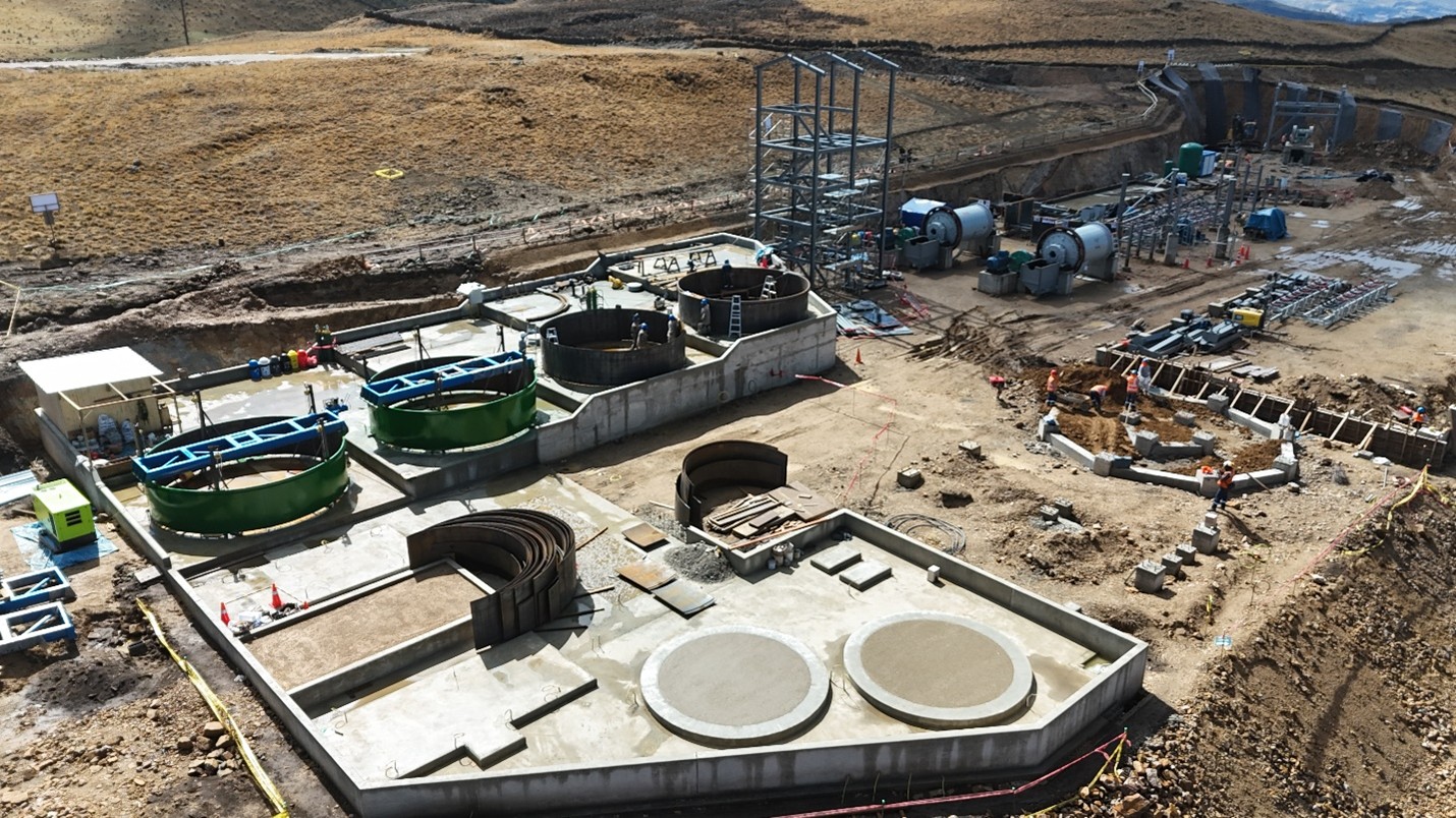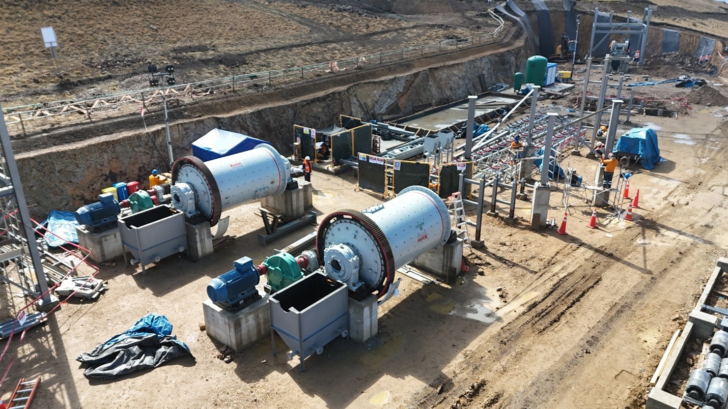 The EPC contractor has installed the two 7'x12' ball mills and jaw crusher. The mill motors and reduction gearboxes are also in place and the ring gears installed. Several metal structures such as the cyclone tower, fines hopper, coarse ore hopper, and conveyor belt support structures are also being assembled.