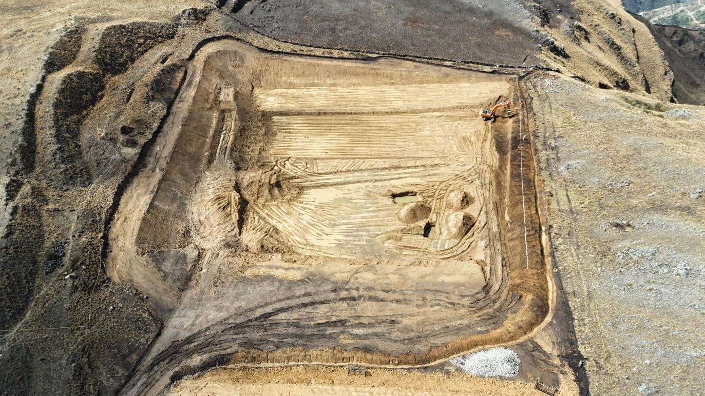 The earthworks of the tailings management area are in the final stages (sufficient for the first year of operation) and the drainage channels and collection ponds are being finished. An impermeable membrane will be installed on the surface, together with a drain system using perforated plastic tubes covered with crushed stone. Geotubes will be paced on this surface and filled with tailings slurry, with process water being recovered by the drainage system and recycled to the process.