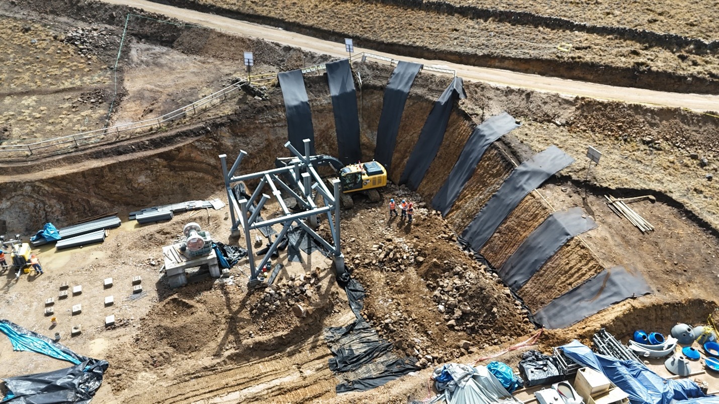 The EPC contractor continues with the last part of the civil works, with the construction of the retaining wall to allow trucks to tip ore into the coarse ore hopper and the circular pedestals for the water tanks and thickener, in addition to the bases of the desorption plant (rectangular), among others.