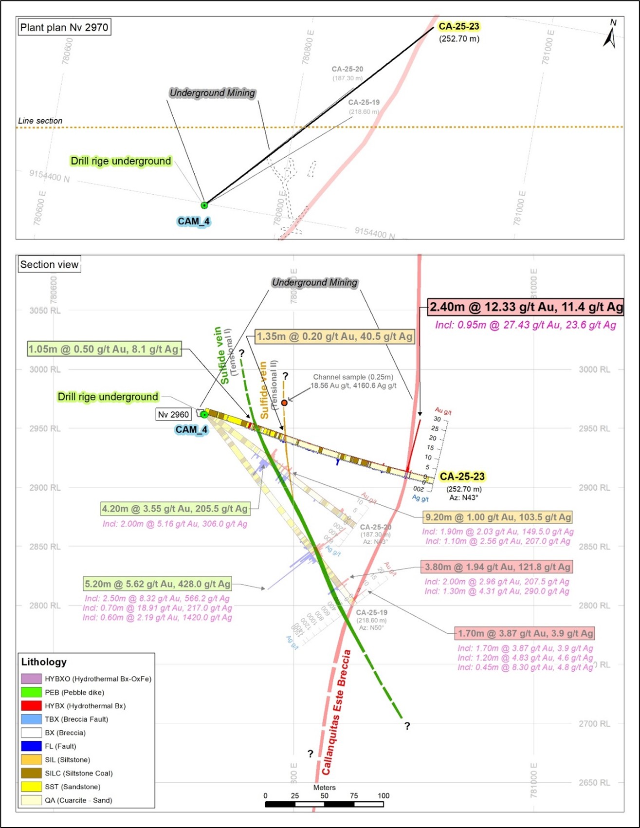 The drillhole CA-25-23 intercepted the Callanquitas Este structure and Tension Vein sulfide zone, located 150 meters north of 07 and 35 meter above. The best being the section grading 12.33 g/t Au and 11.4 g/t Ag over 2.4 meters, Callanquitas Este (oxide mineralized zone, goethite - limonite). It also intercepted sections of low-grade tension veins (mixed zone).