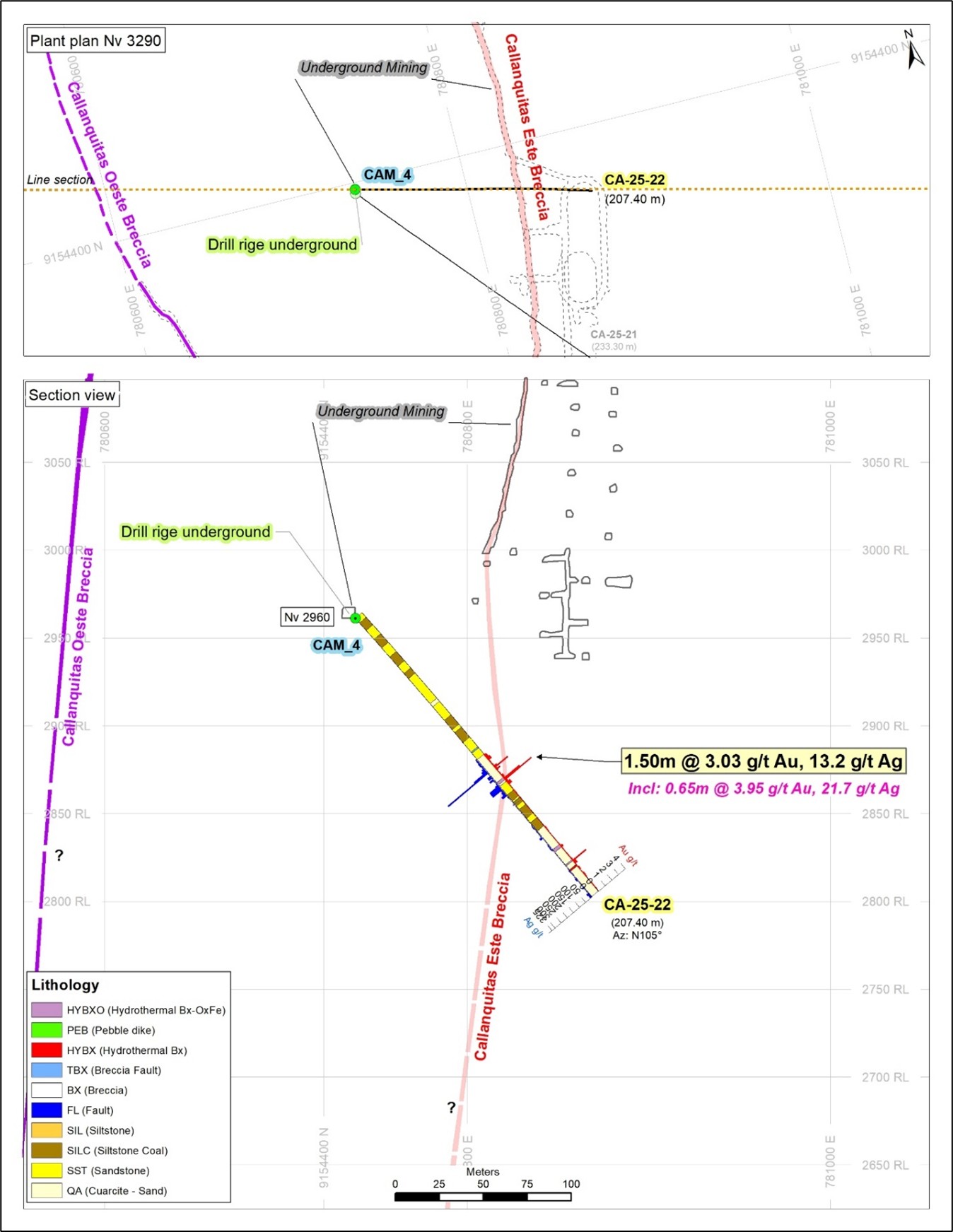 The drill hole CA-25-22 intercepted a mineralized section grading 3.03 g/t Au and 13.2 g/t Ag over 1.5 meters at Callanquitas Este (mixed mineralized zone).