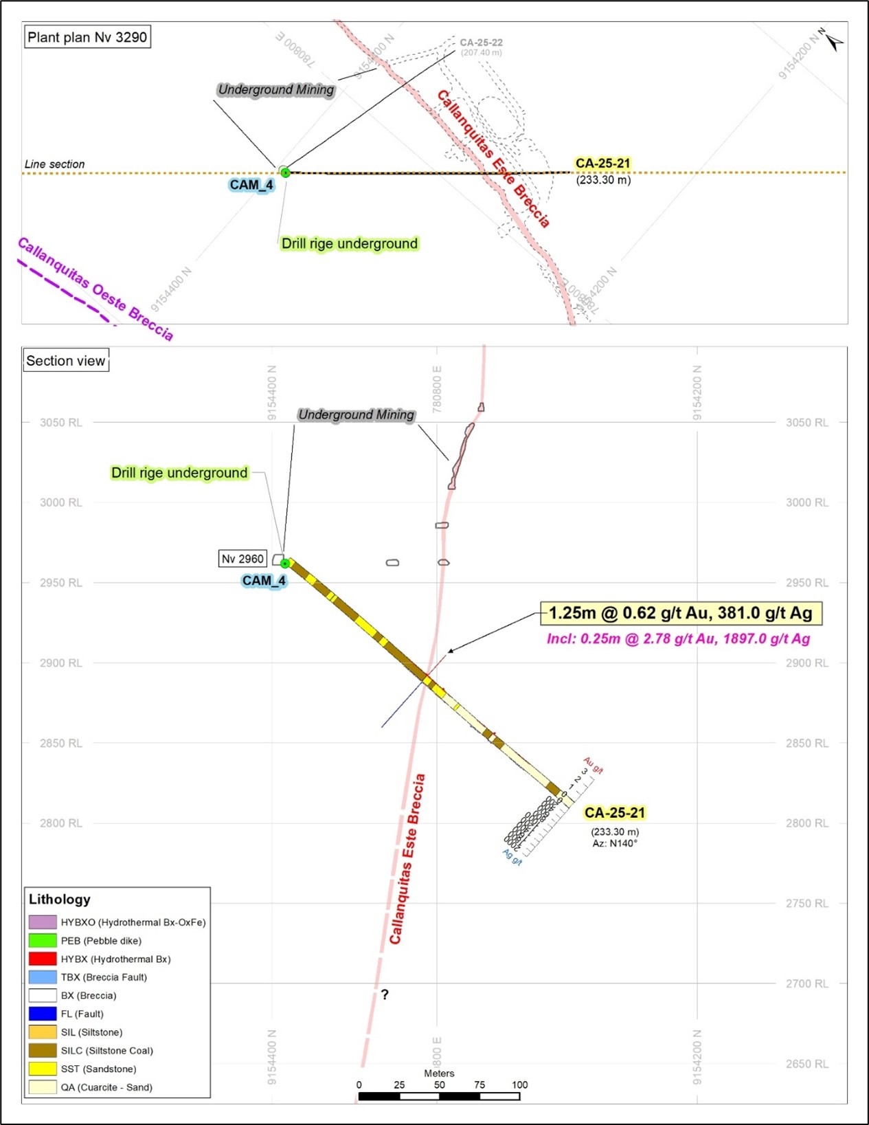 The drill hole CA-25-21 intercepted a mineralized section grading 0.62 g/t Au, 381.0 g/t Ag and 0.3% Cu over 1.25 meters and includes a grade of 2.78 g/t Au, 1897.0 g/t Ag and 1.3% Cu over 0.25 meters at Callanquitas Este (sulfide zone).