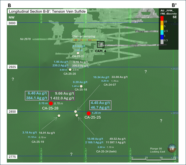 The Drill hole CA-25-28 intersected the mineralized zone grading 6.40 g/t Au and 384.1 g/t Ag over 3.15 meters and it includes a grade of 9.66 g/t Au and 1432.0 g/t Ag over 0.70 meters, occurs within the tension vein (mixed mineralized zone).