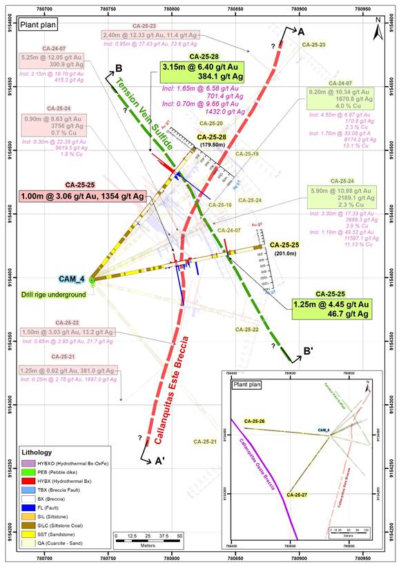 The drillhole CA-25-25 intercepted the Callanquitas East structure and Tension Vein sulfide zone, located 30 meters south and 20 meters above the point 07 (Callanquitas East); and 25 meters south of 07 (Tension Vein sulfide). The intersection grades 1.18 g/t Au and 458.8 g/t Ag over 3.6 meters in Callanquitas East (mixed mineralized zone, goethite - limonite and pyrite). It also intercepted mineralization in the tension vein (sulfide) and grades 4.40 g/t Au and 46.7 g/t Ag over 1.25 meters. The drill hole CA-25-24, the last section of mineralization consists of oxides grading 2.69 g/t Au and 10.2 g/t Ag over 2.90 meters and includes a grade of 4.69 g/t Au and 15.6 g/t Ag over 0.70 meters (oxide zone).
