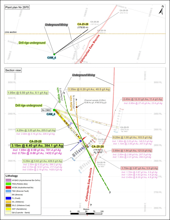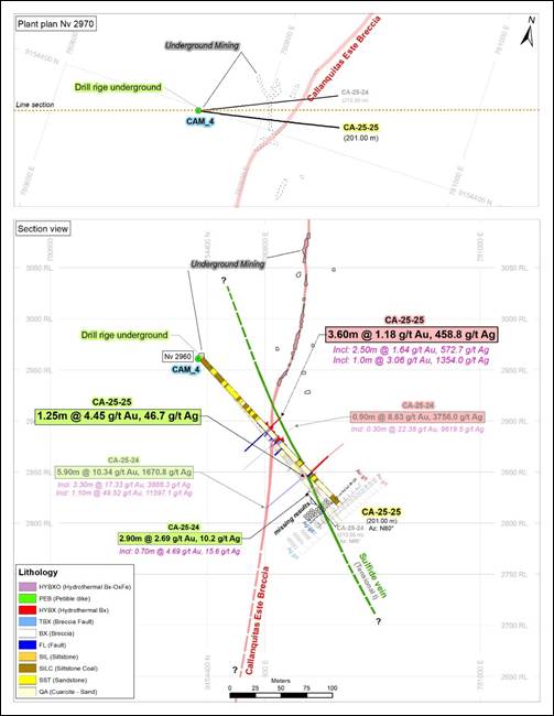 The drill hole CA-25-25 has two mineralized zones, the intersection grades 3.60 g/t Au and 458.8 g/t Ag over 3.60 meters, it includes a grade of 3.06 g/t Au and 1354.0 g/t Ag over 1.0 meters, within Callanquitas East (mixed mineralized zone). It also intercepted mineralization within the tension vein (sulfide) grading 4.40 g/t Au and 46.7 g/t Ag over 1.25 meters.